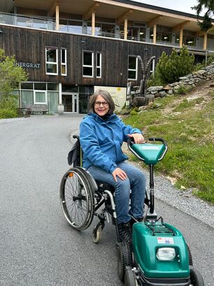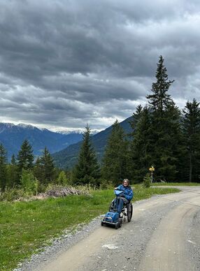 Mit dem Swiss-Trac erhöht man seinen Aktionsradius und somit konnte ich mit meiner Tochter Wanderwege fahren. Per einfacher Kupplung wird der Elektroantrieb am Rollstuhl befestigt und ermöglicht selbstständige Fahrten bis zu 30 km. Hindernisse wie Absätze bis 13 cm, Kopfsteinpflaster, Naturwege oder Steigungen (je nach Modell bis 20 %) werden mühelos und kippsicher überwunden – auch bei eingeschränkter Greiffunktion.