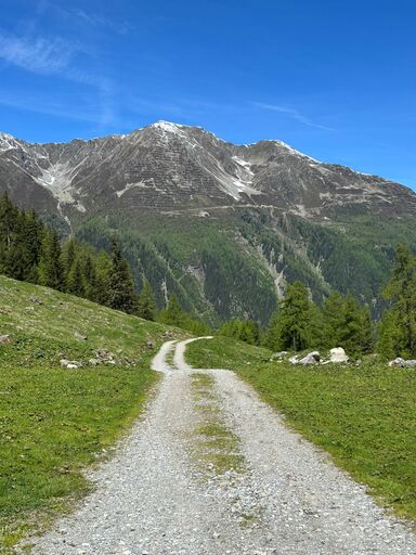 Danach geht es auf einem leicht geneigten und festen Schotterweg weiter, bevor der Weg ca. 1 km vor der Alm auf teilweise grobem Schotter noch spürbar ansteigt.